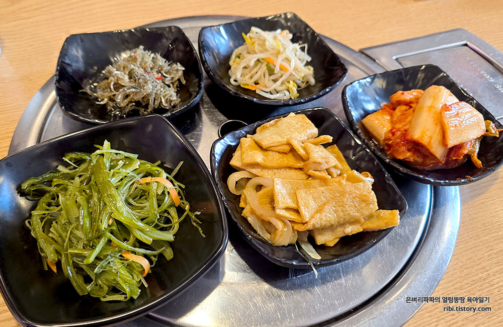 반찬을 추가로 담아 다섯 가지 반찬으로 즐겼습니다.
