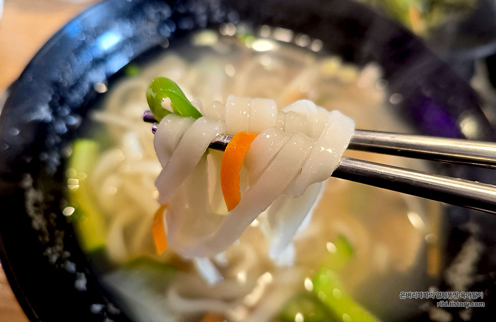 넓적하고 쫄깃한 면발은 국물을 머금어 부드럽게 후루룩 넘어갑니다.