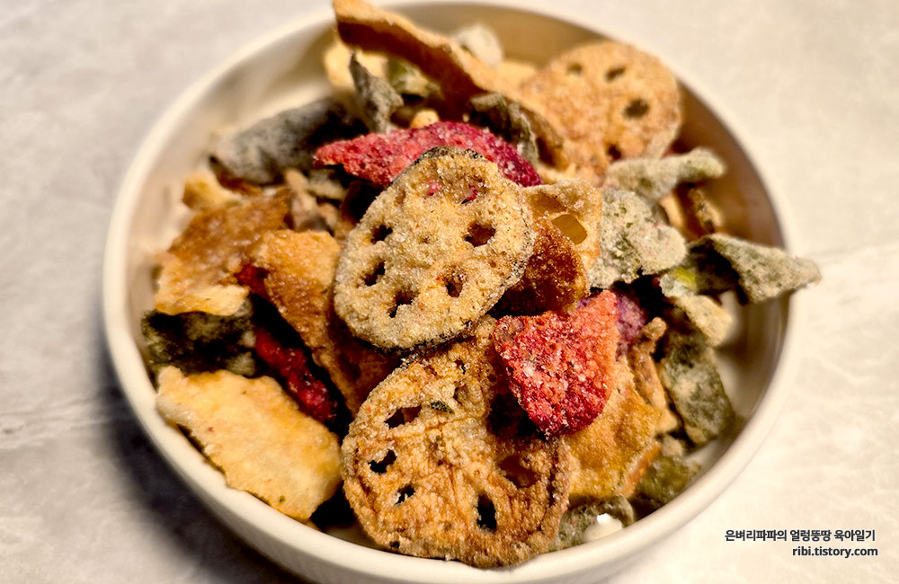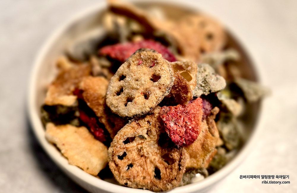 단순히 야채칩이 아닌 연근, 호박, 비트, 자색고구마, 다시마, 김, 우엉을 튀겨낸 것이에요.