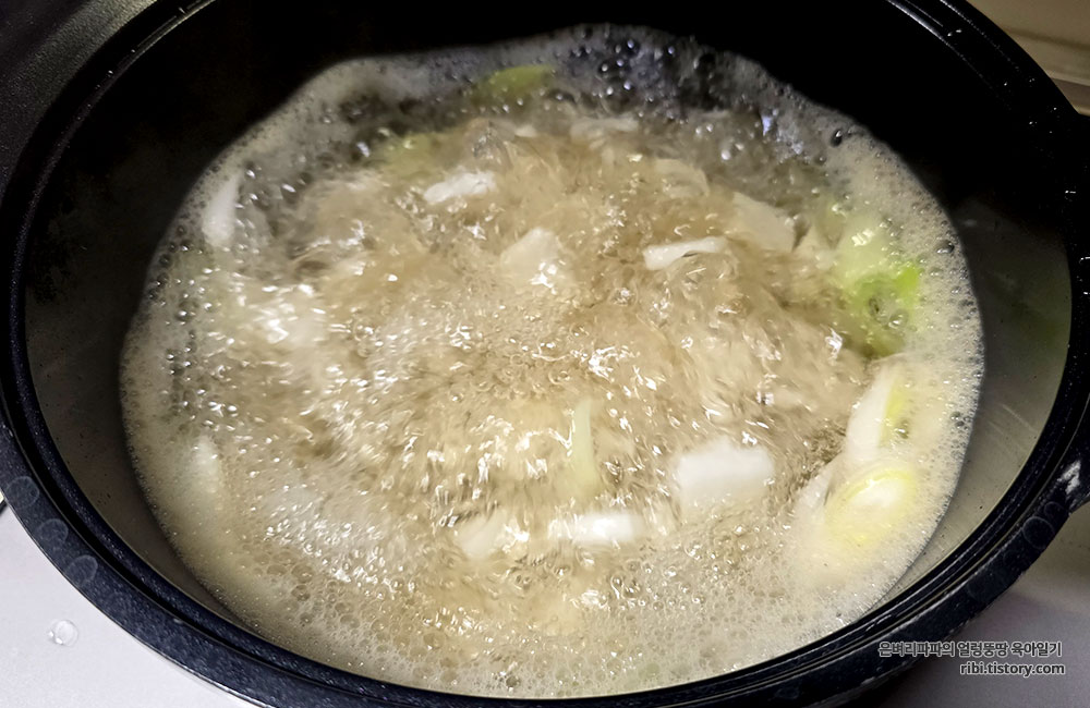 육수가 끓기 전, 썰어놓은 무와 대파의 흰 줄기 부분을 먼저 넣고 시원한 맛을 우려냅니다.