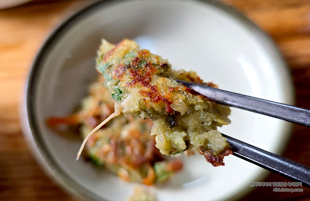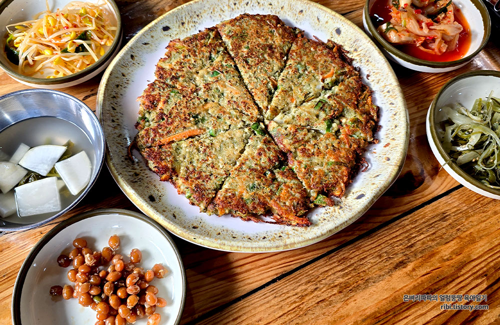 밑반찬을 한 가지씩 맛보고 있으니, 금세 녹두전이 나왔습니다.