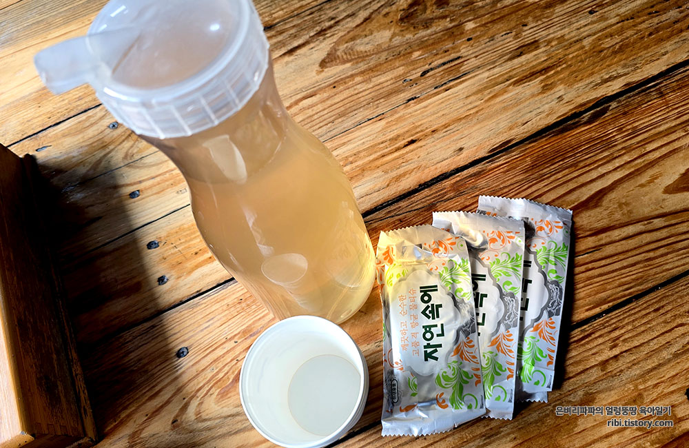 자리에 앉으니, 구수하고 따뜻한 옥수수보리차와 종이컵, 물수건을 가져다주셨습니다.
