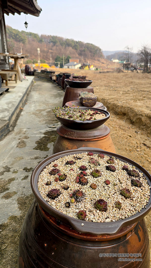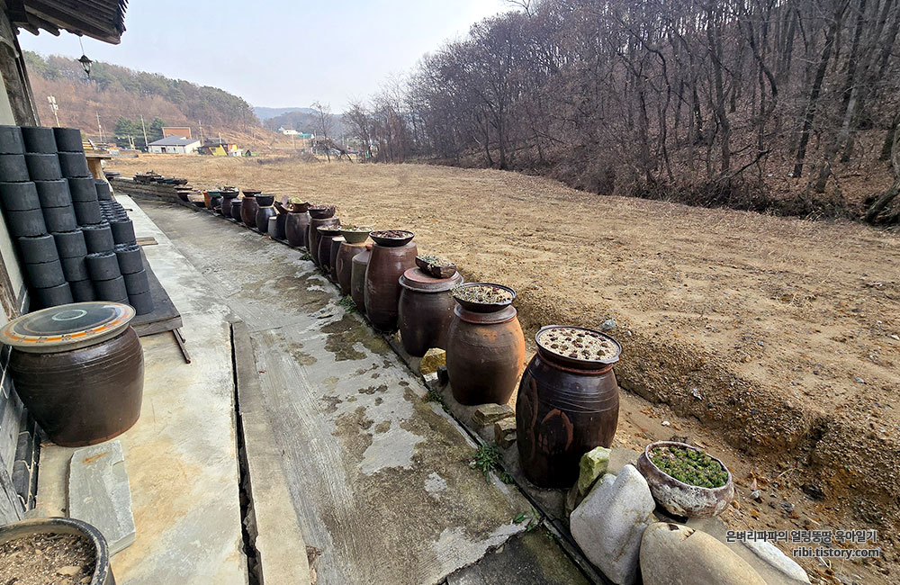 고즈넉한 시골 풍경을 배경으로 장독대가 눈에 띕니다.