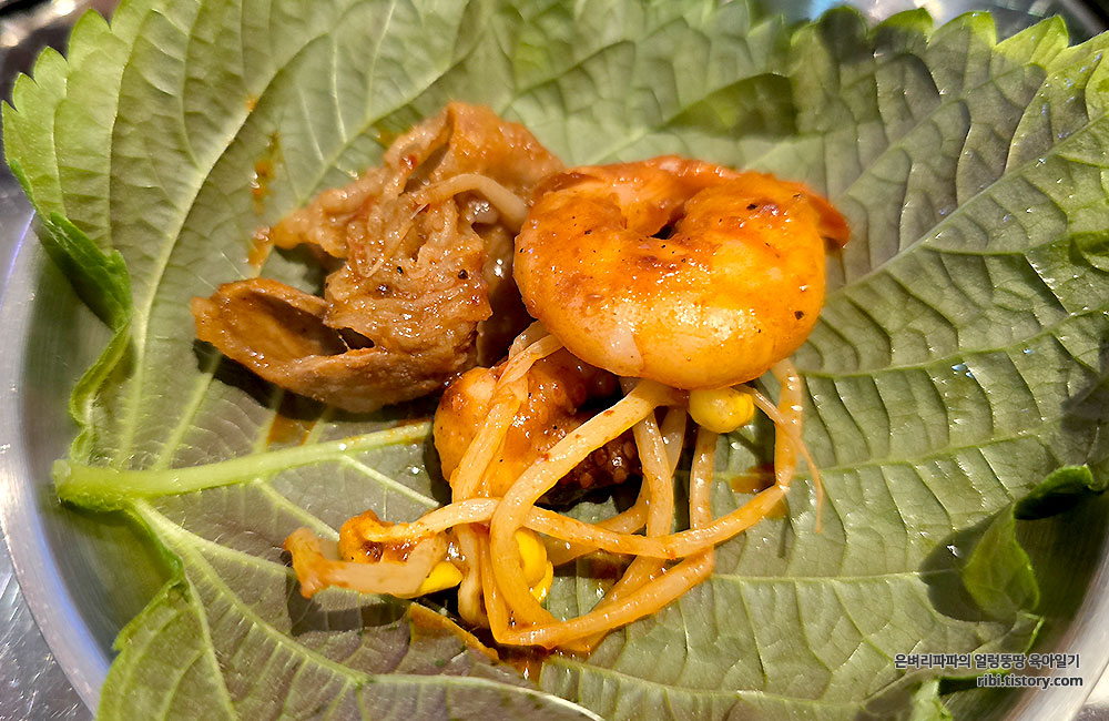 쌈무로 싸서 먹고, 깻잎에 주꾸미, 탱글한 새우, 우삼겹과 마늘 한 점을 넣어 크게 한입 싸 먹으니...