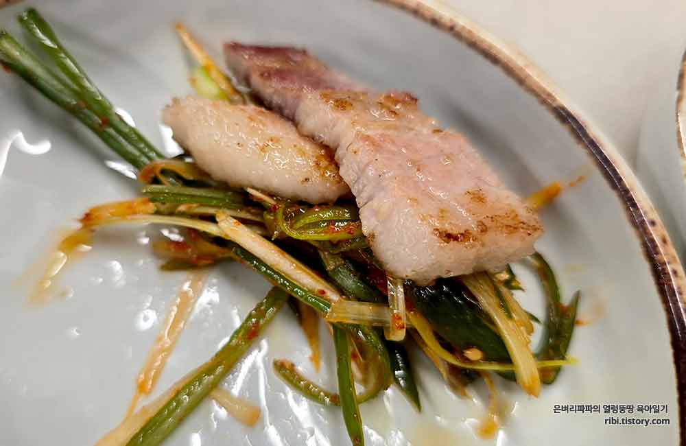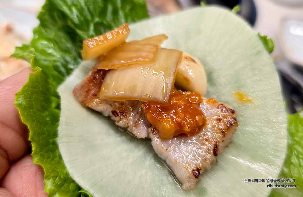 소금에 찍어 먹고, 쌈무나 쌈채소에 파무침과 함께 싸서 먹으니 꿀맛이네요.