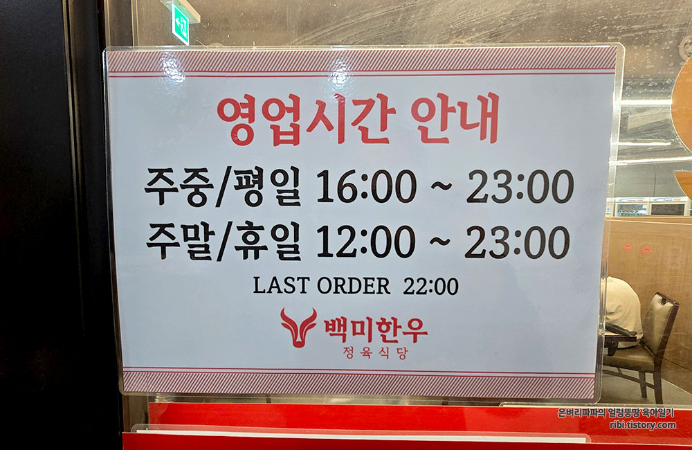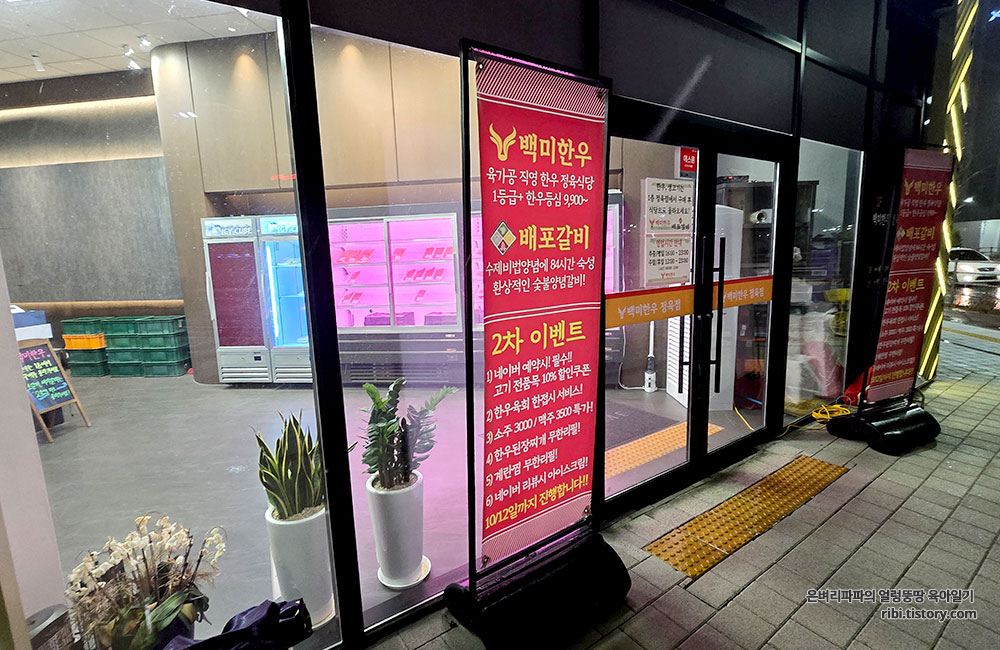 1층은 백미한우 정육점, 2층은 백미한우 정육식당, 3층은 배포갈비라는 간판이 붙어 있네요.