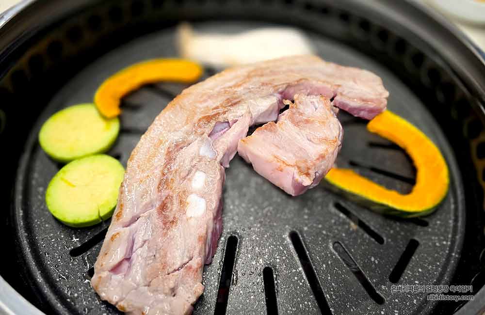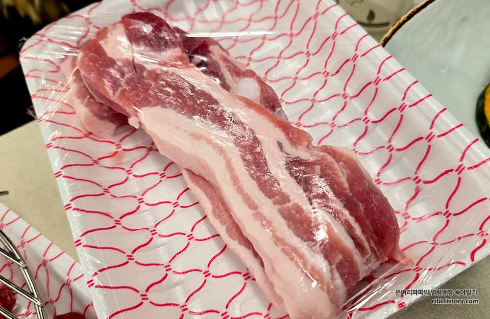 생삼겹살을 먼저 먹고, 마지막에는 달콤한 돼지갈비와 함께 식사를 하기로 했어요.