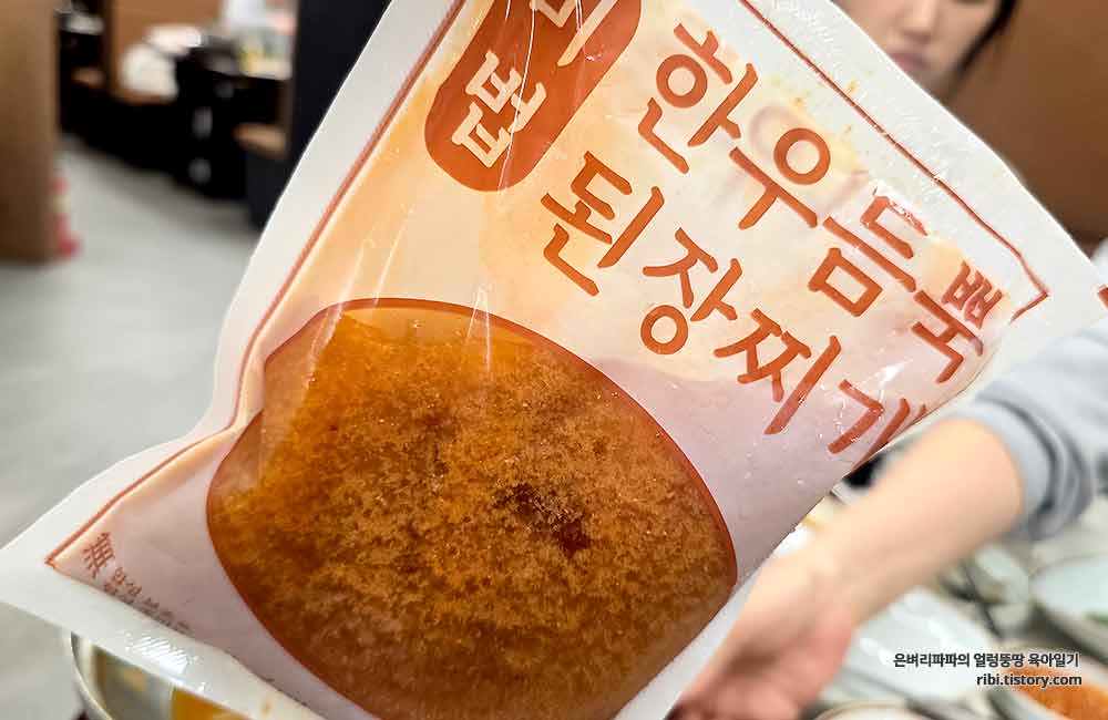 된장찌개가 끓기 시작할 무렵, 서비스로 받은 소고기를 넣어 다시 한번 보골보골 끓여줍니다.