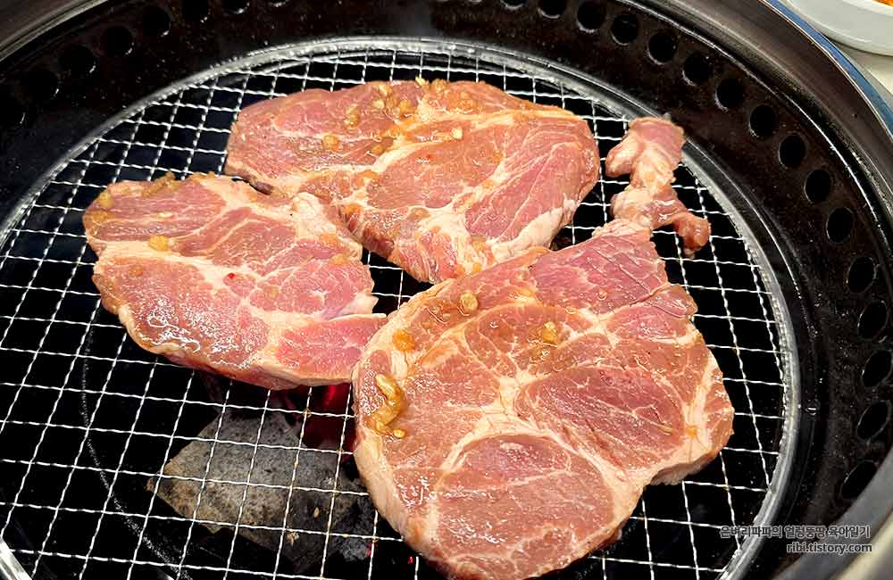 직원이 불판을 교체하고, 처음 주문 시에 함께 주문한 돼지갈비를 불판 위에 올려