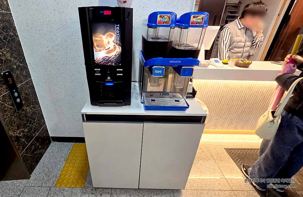 식사를 마치고 카운터 옆에 자리하고 있는 아이스티와 자판기커피로 식사를 마무리했습니다.