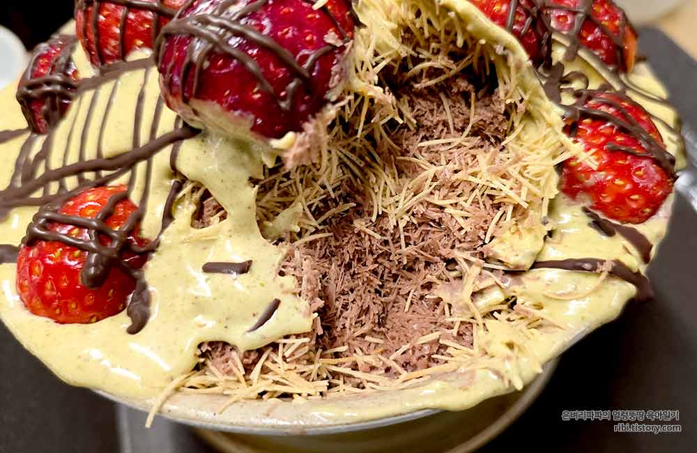 시즌이 끝나기 전에 추천드리고 싶은, 카페길섶의 "두바이 초콜릿 딸기 빙수"입니다.