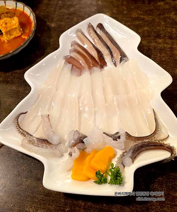 싱싱한 오징어회가 크리스마스트리 모양의 하얀 접시에 정갈하게 담겨 있어 시선을 사로잡았어요.