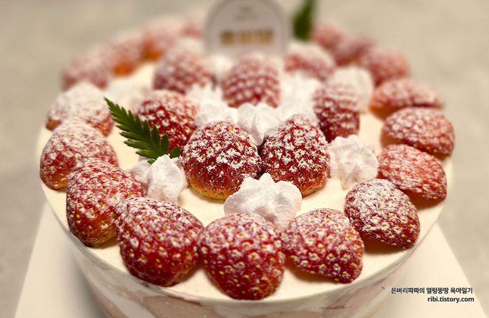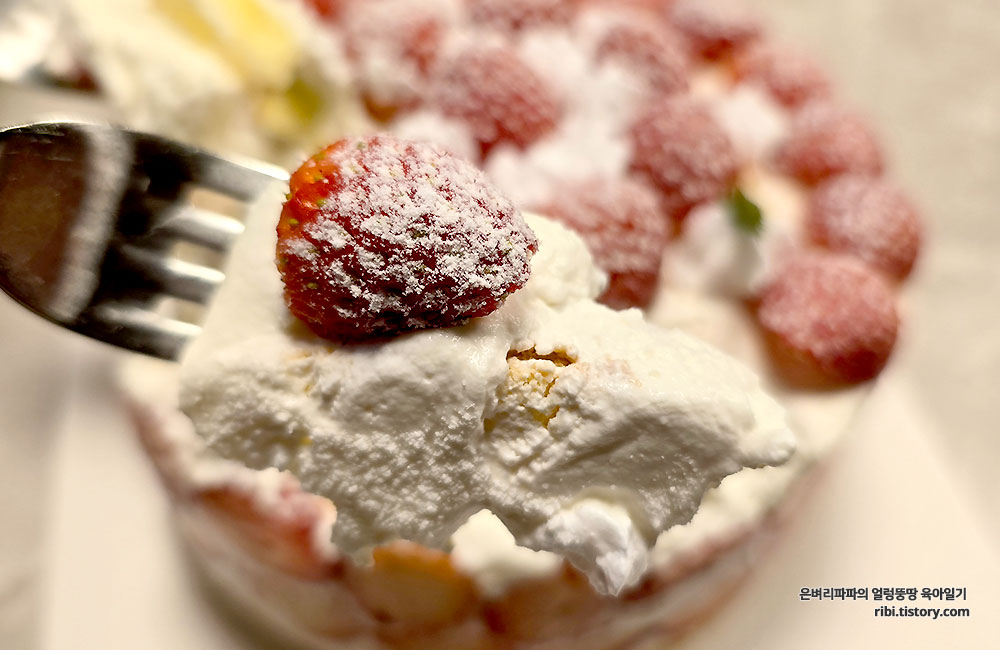 부드러운 생크림에 슈가파우더 옷을 입은 딸기는 정말 달콤했습니다.