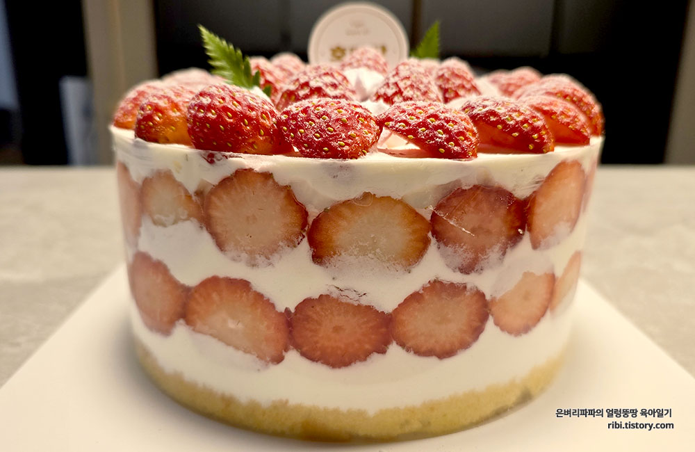 케이크 옆면부터 위쪽까지 빈틈없이 꽉 찬 딸기 양에 한번 놀라고,