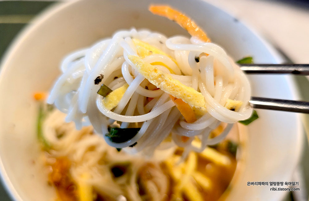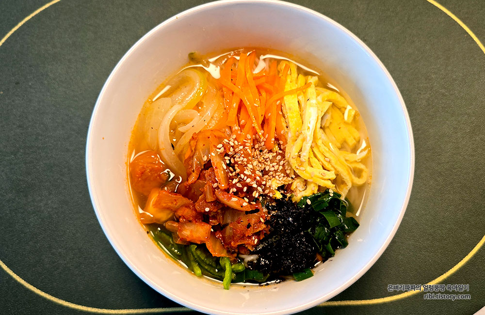 고명을 잘 섞어 한 젓가락 크게 입에 넣으니, 뜨끈한 국물과 볶음김치의 감칠맛이 느껴집니다.