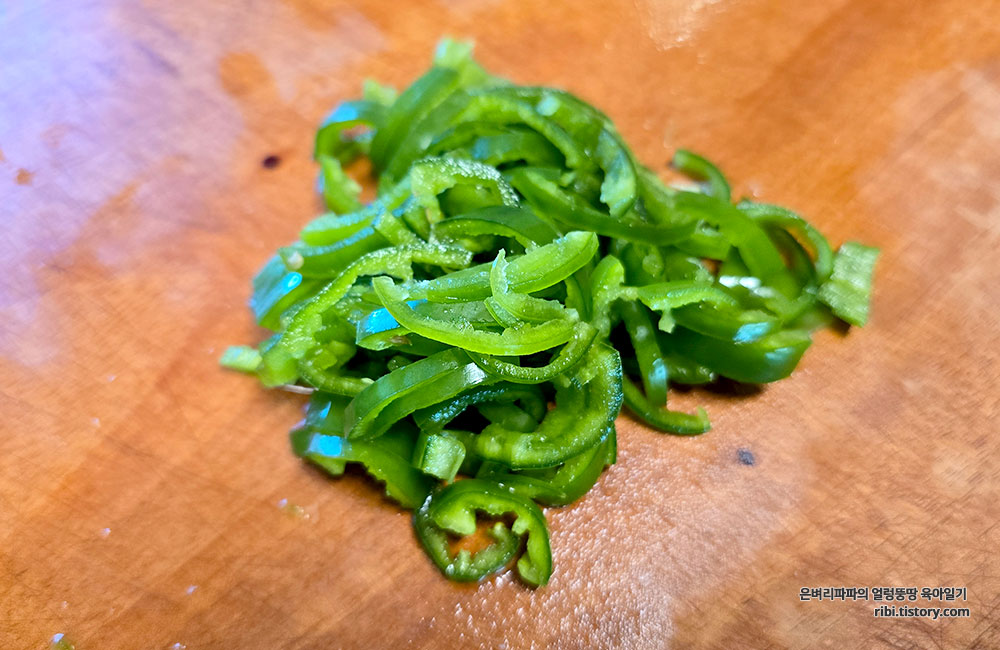 냉장고에 고추가 있길래, 반으로 갈라 씨를 제거하고 썰어 준비했어요.