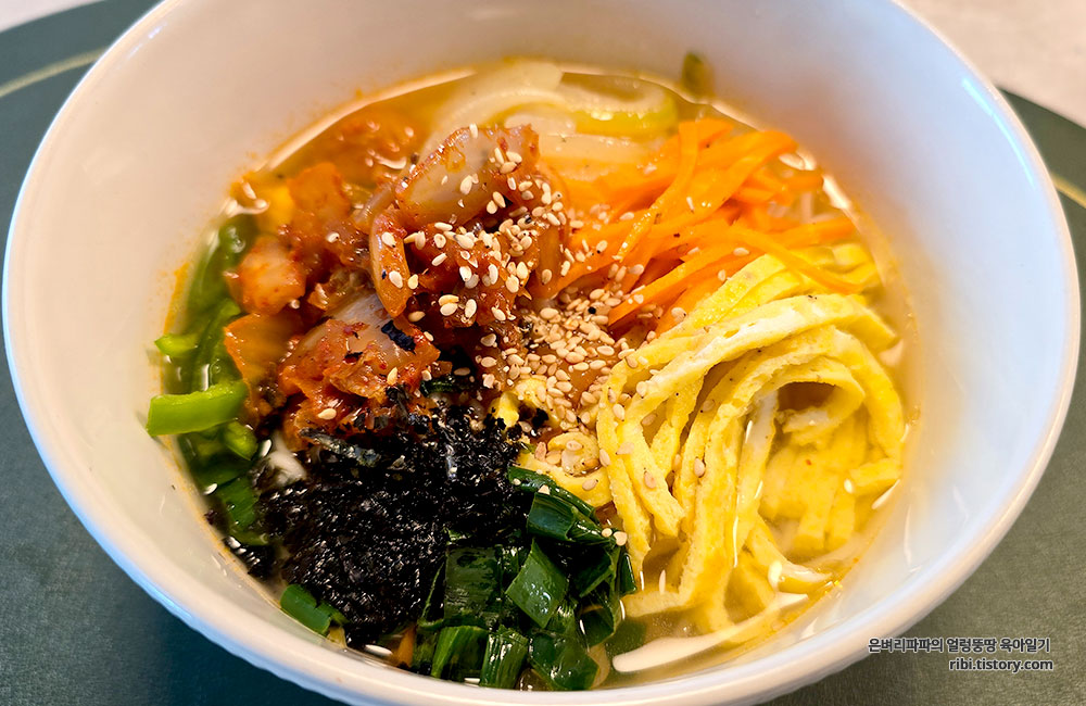 먹을 때 각자 취향에 맞게 김치만두를 얹어 먹기로 했습니다.