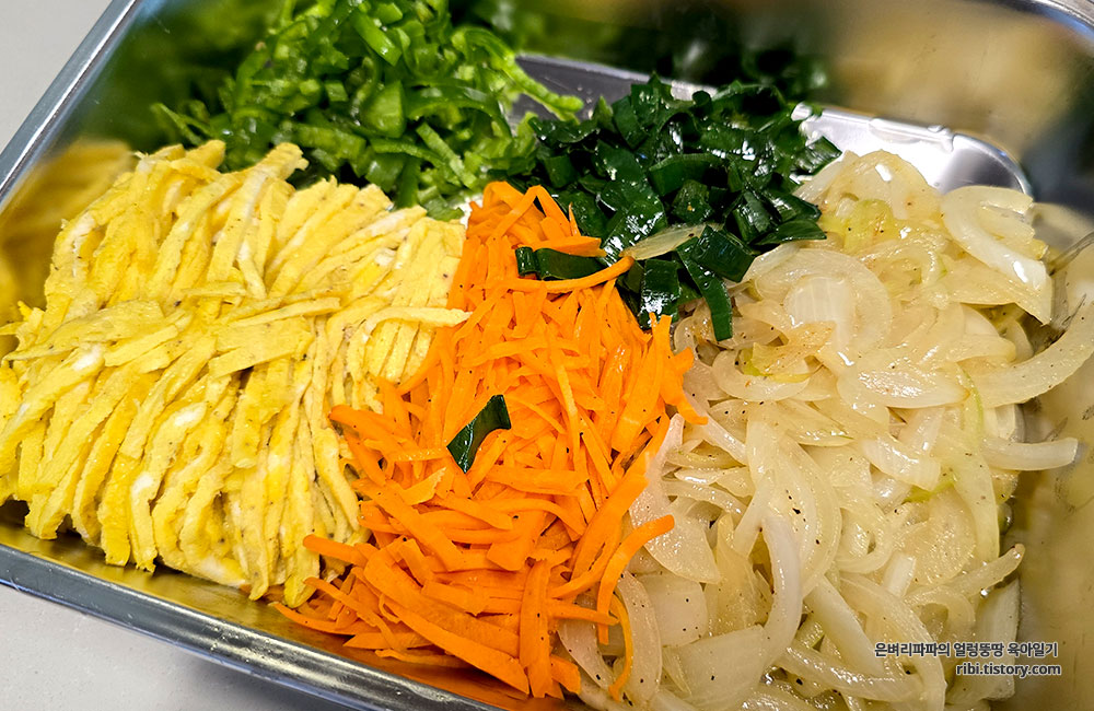 정성껏 채 썬 달걀지단과 당근, 양파, 초록빛 호박대신 올린 대파와 김가루