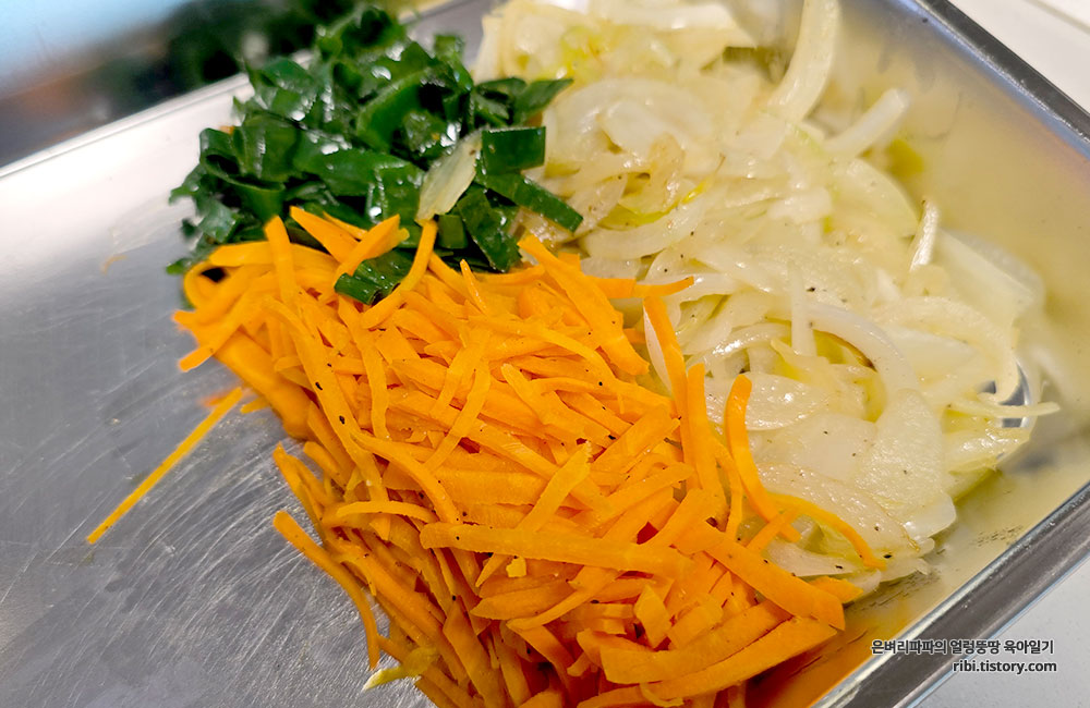 양파와 당근은 채 썰어 올리브유를 두르고 소금과 후추로 간을 해서 봈습니다.