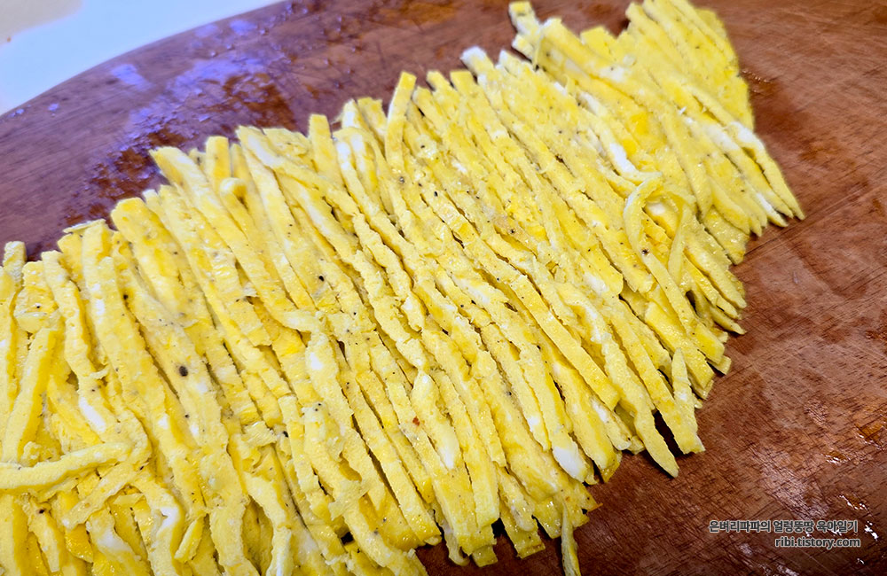 계란은 잘 풀어 소금과 후추 한 꼬집 넣어 지단을 부치고 얇게 썰어 준비했어요.
