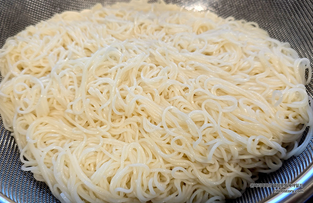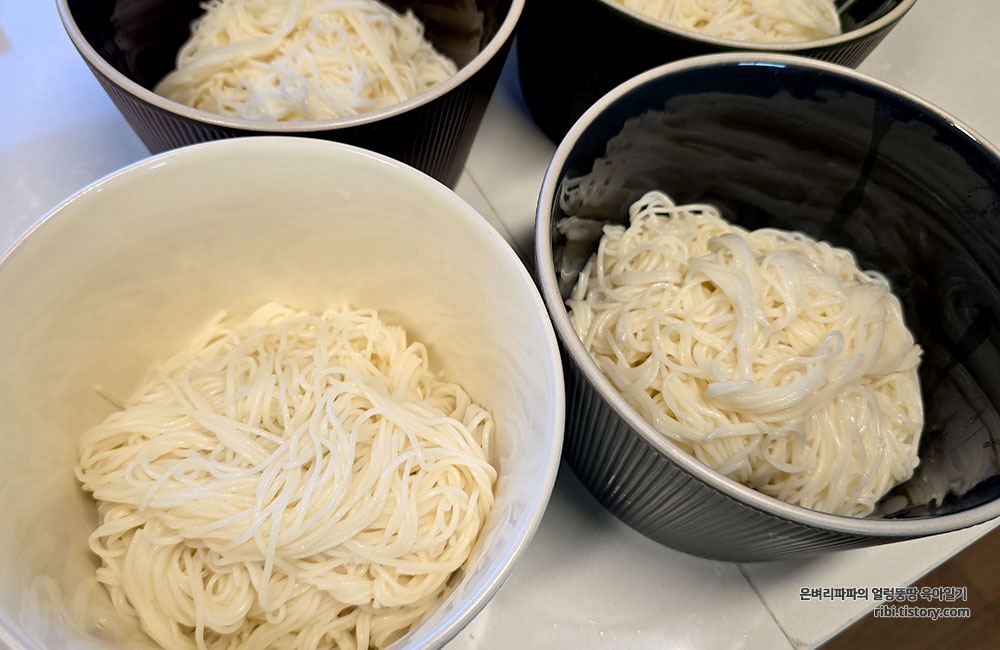 국수는 삶아서 차가운 물에 여러 번 헹궈 전분기를 제거해 줍니다.