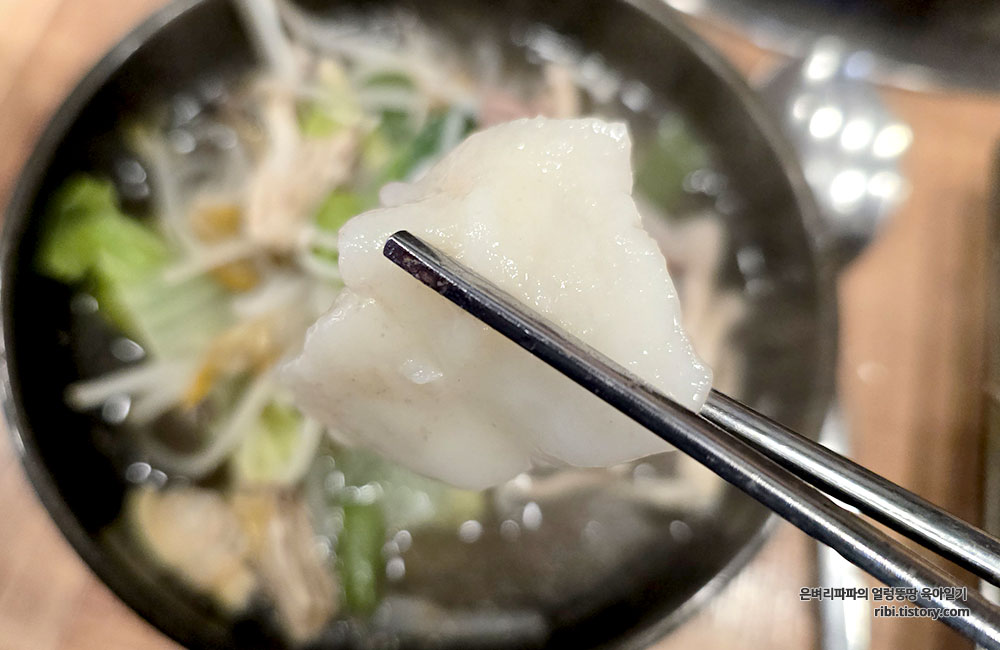 먹다가 보니, 육수에는 바지락뿐만 아니라 쫄깃한 수제비도 들어가 있더라고요.