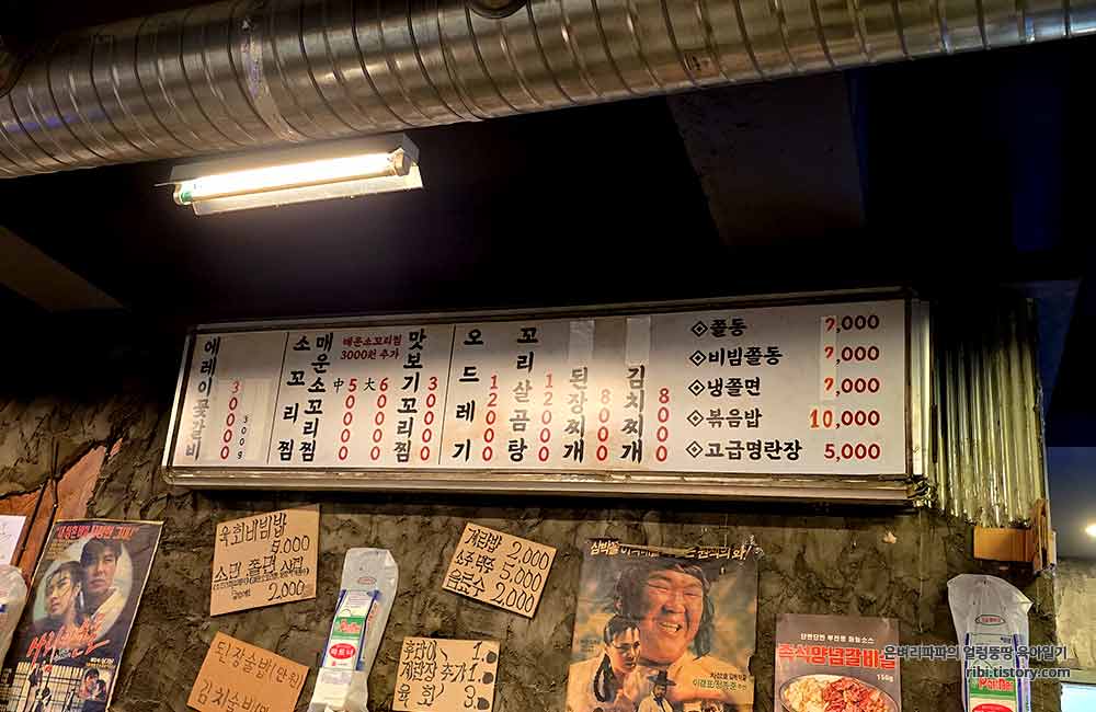 벽면에 붙은 손글씨 메뉴판과 옛날 포스터들이