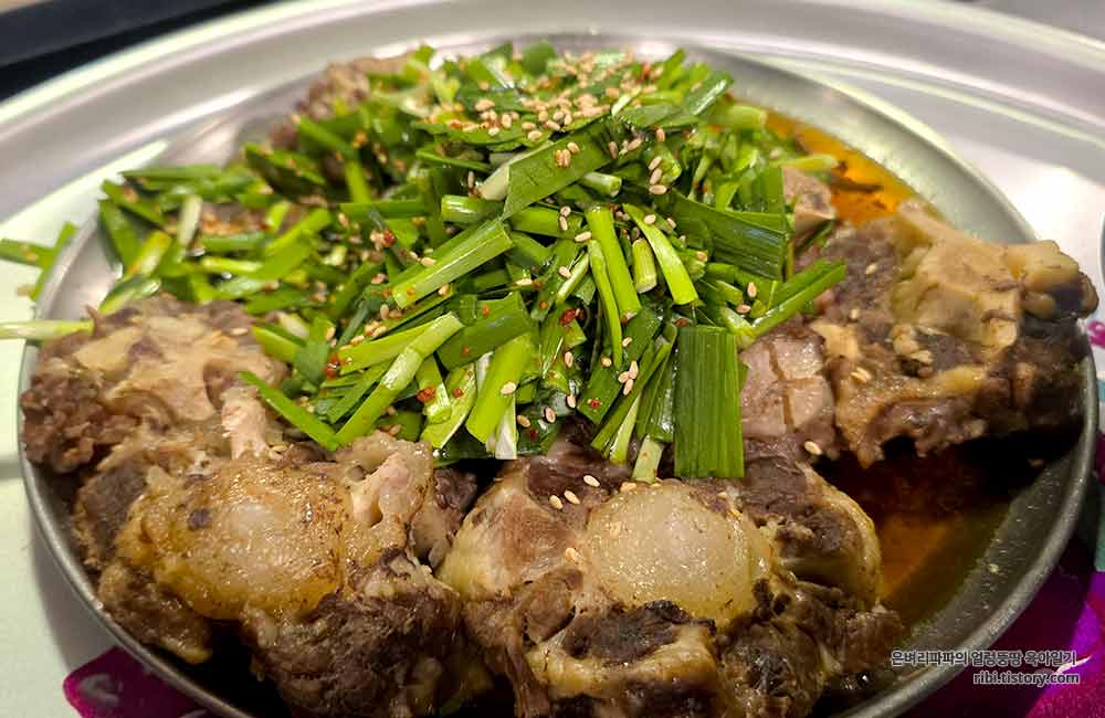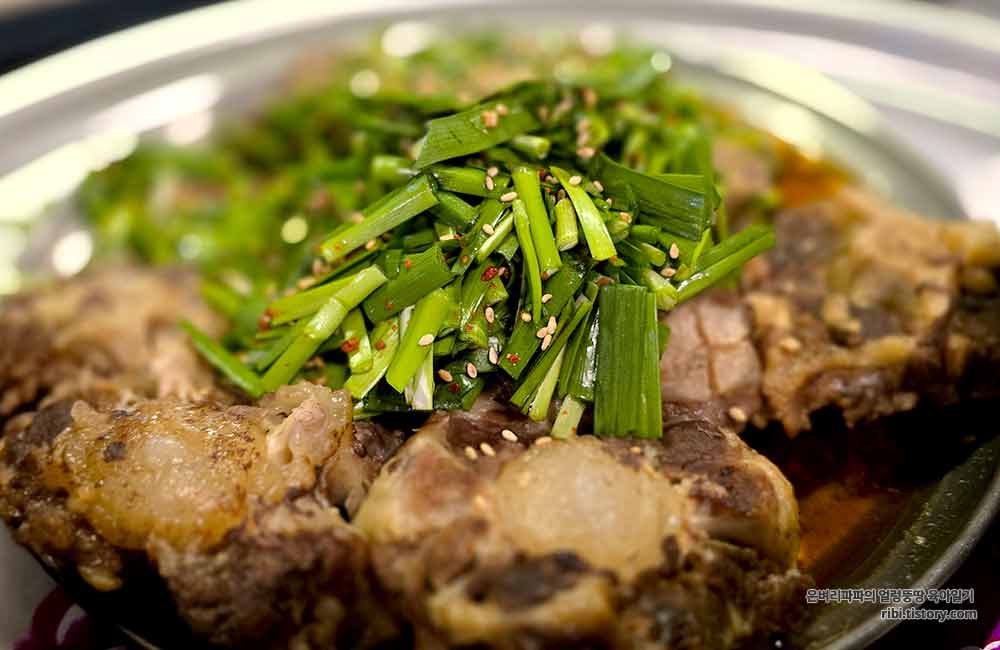신선한 부추를 고기가 보이지 않을 정도로 수북하게 쌓아준 부추 소꼬리찜은 식욕을 자극합니다.