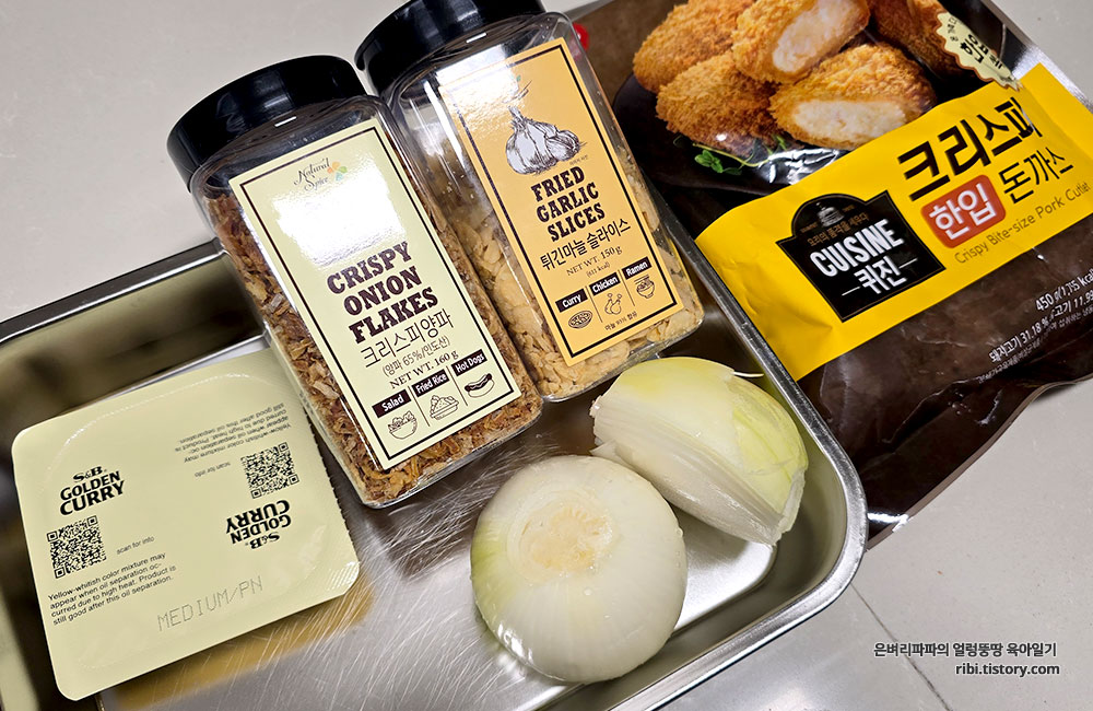 재료 : 고체 카레, 양파, 올리브유, 버터, 물, 마늘 후레이크, 양파 후레이크, 파슬리가루, 시판용 돈가스
