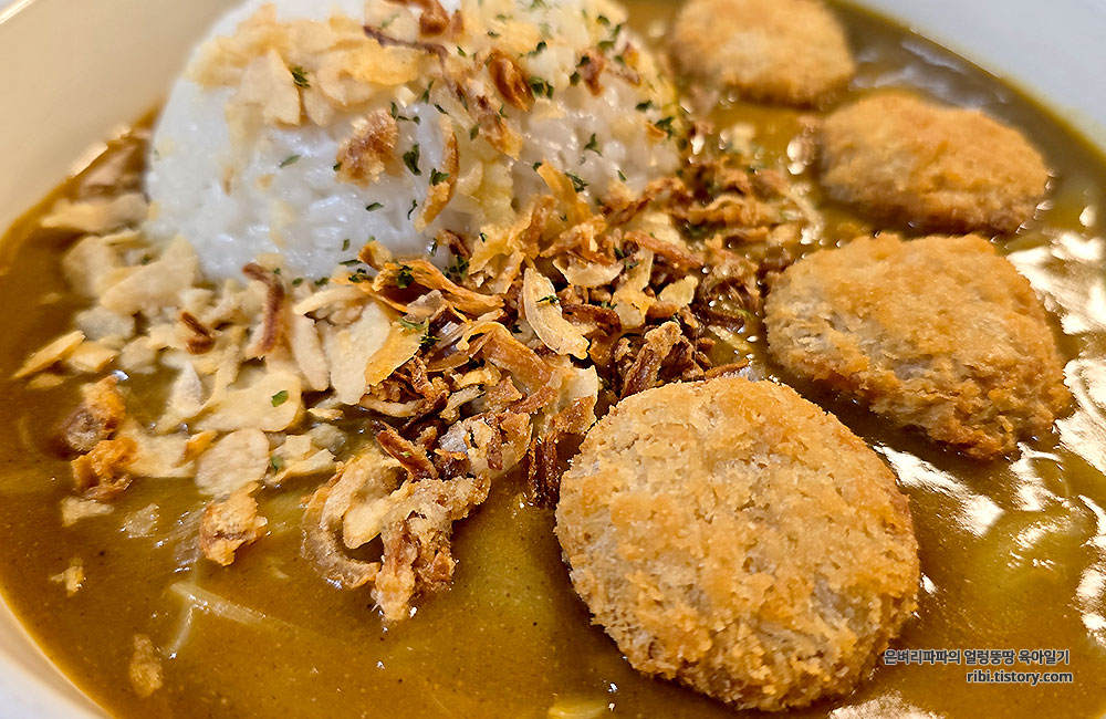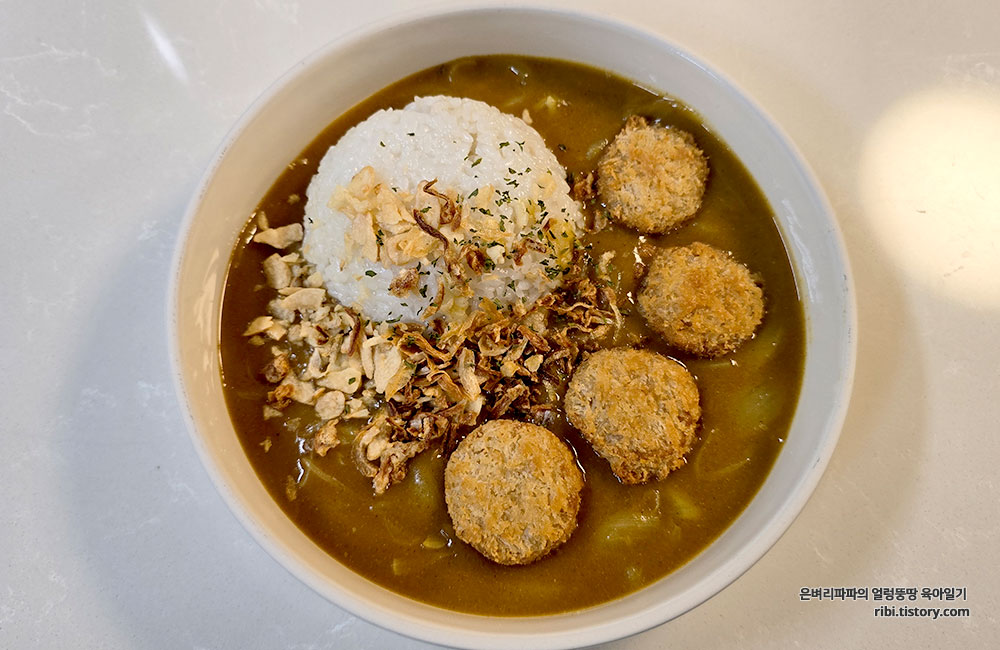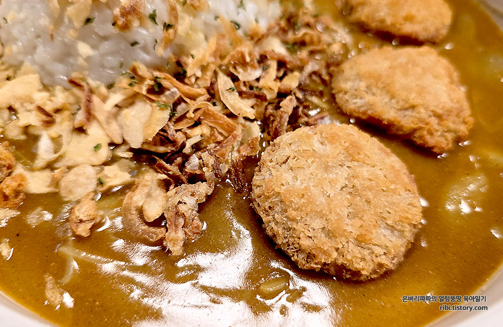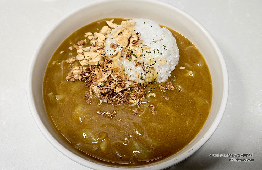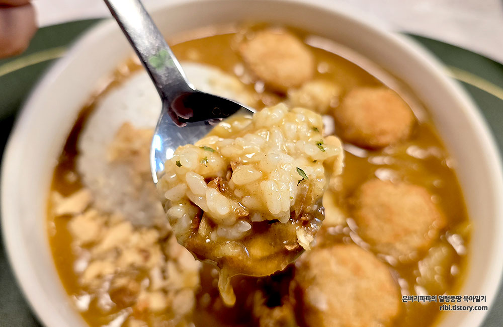 카라멜라이징이 된 양파의 달큼함과 카레의 향긋함이 기분 좋게 어우러집니다.