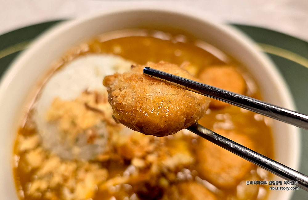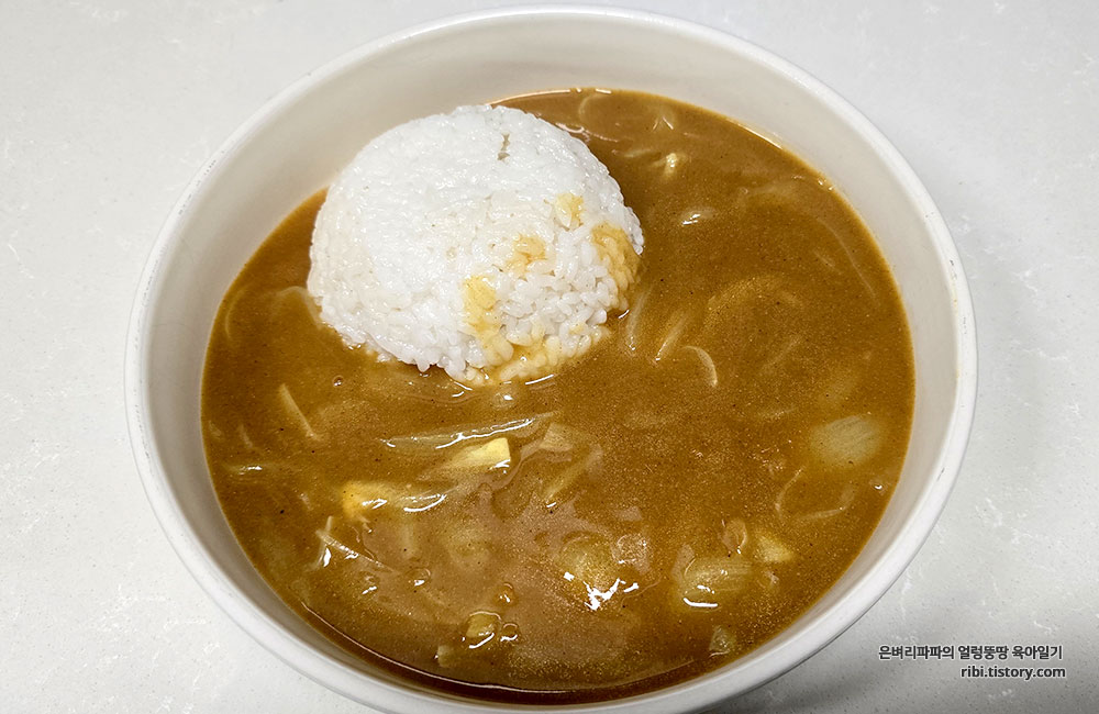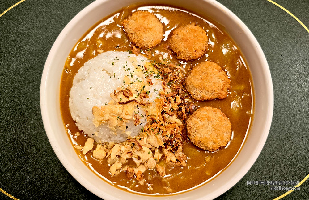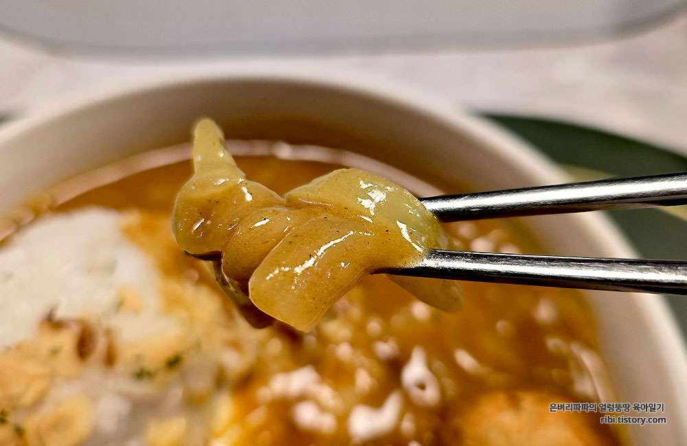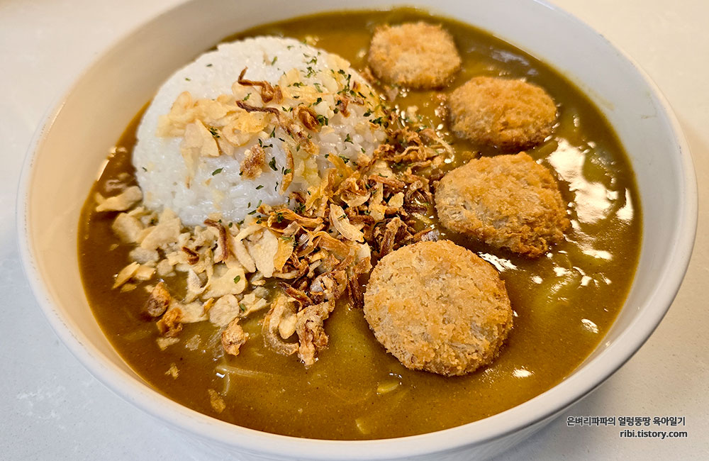 카라멜라이징이 된 양파의 달큼함과 카레의 향긋함이 기분 좋게 어우러집니다.