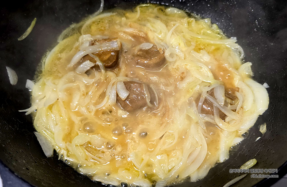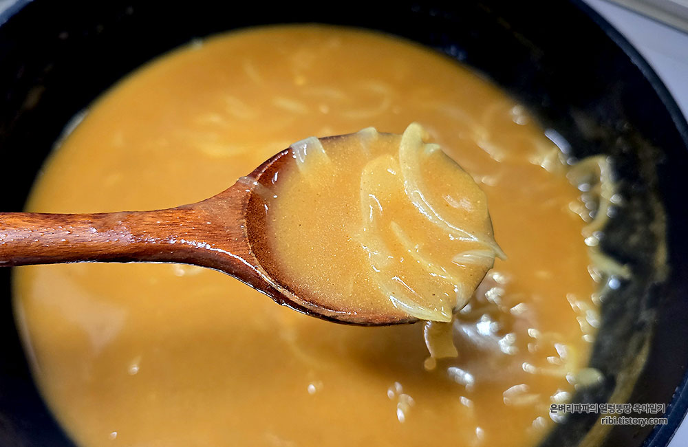 정성껏 볶은 양파 베이스에 고체 카레와 물을 적당히 부어 진하고 꾸덕한 카페 소스를 완성했습니다.