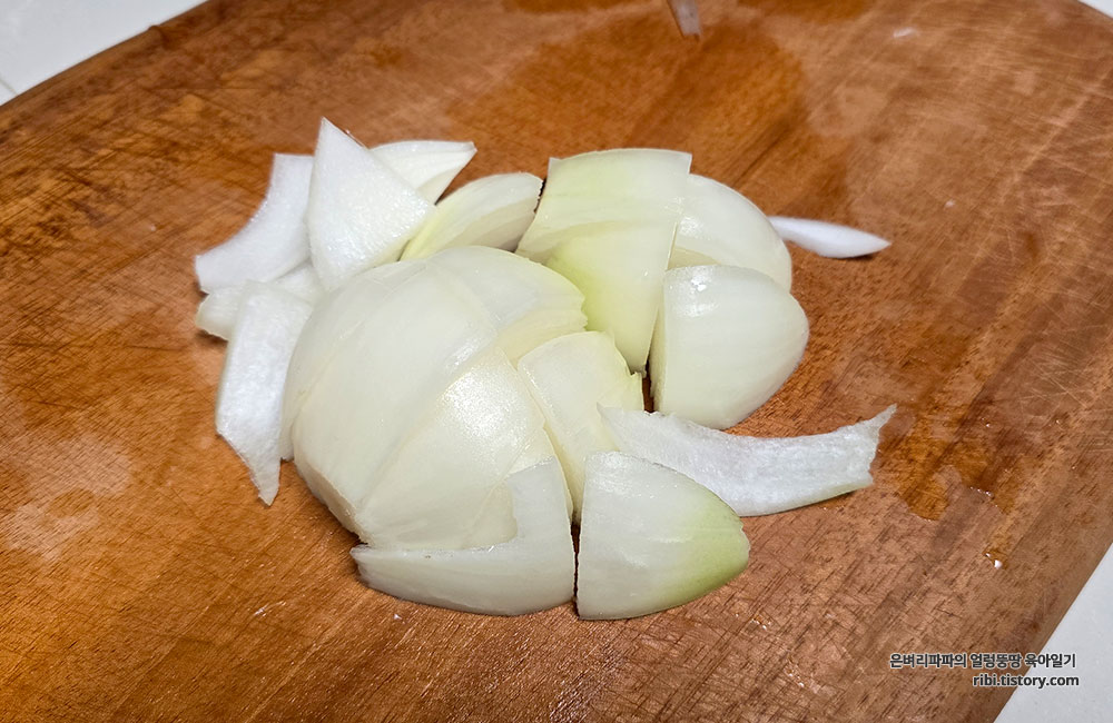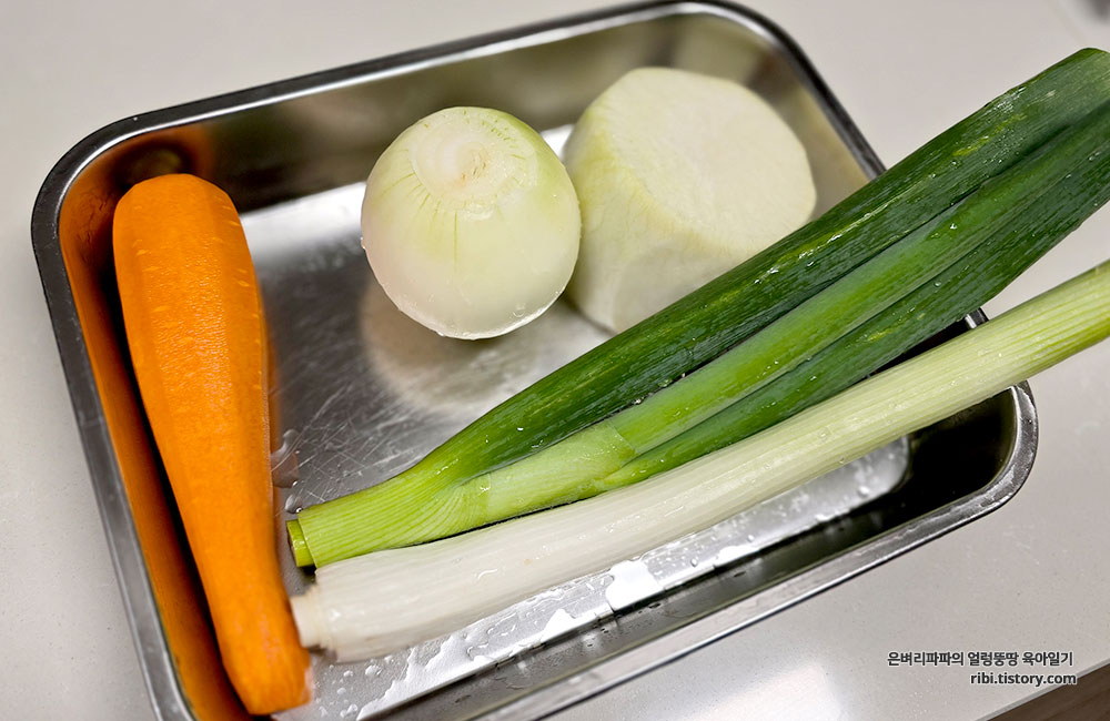 무, 양파, 당근은 큼지막하게 썰어 준비합니다.