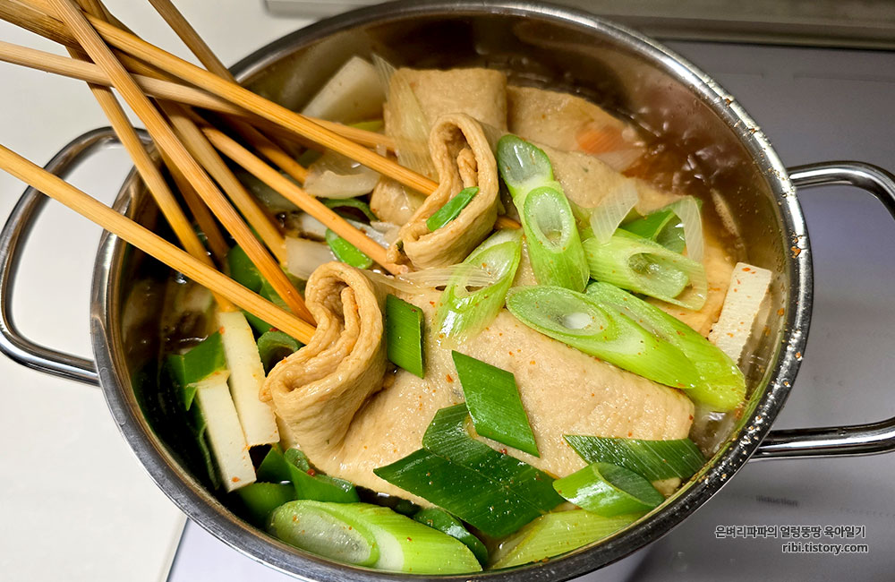 딸의 요청으로 평범한 어묵탕 대신 고춧가루가 들어간 매콤하고 칼칼한 꼬치어묵을 만들어 봤습니다.