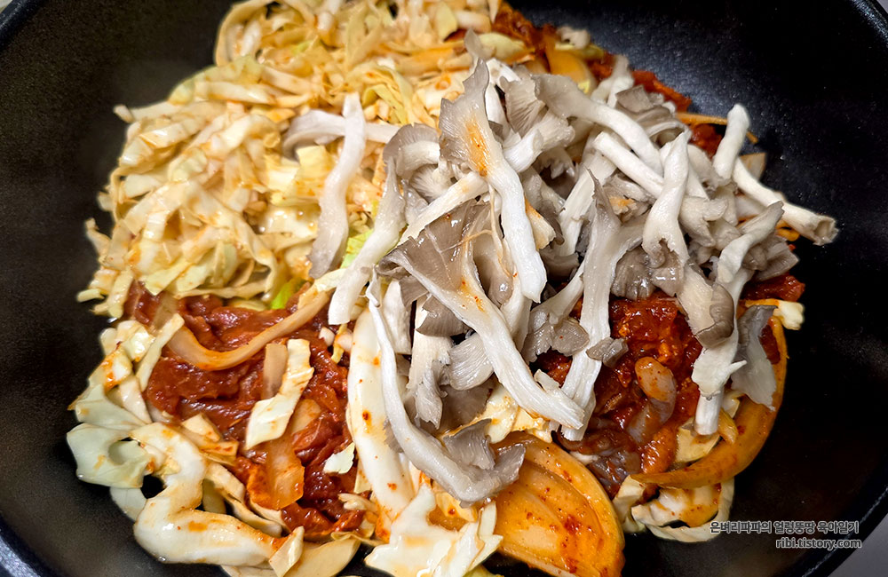 느타리버섯은 식감을 살려주고 양념을 쏙 흡수해 줘서 더 푸짐하게 즐길 수 있고