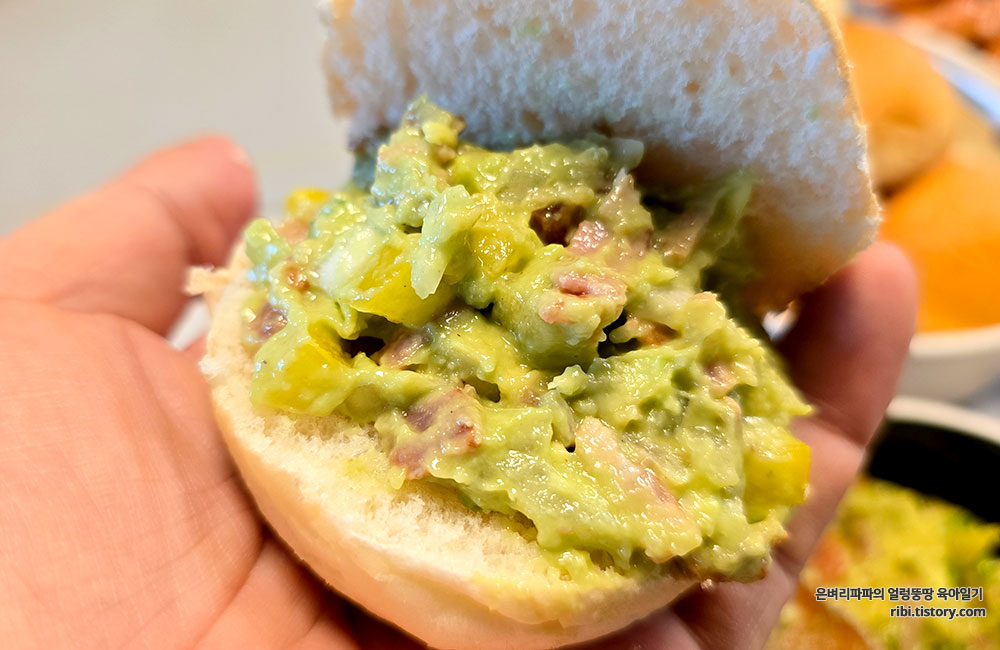 모닝빵을 반으로 갈라, 사이에 베이컨 과카몰리를 가득 넣어 먹었습니다.