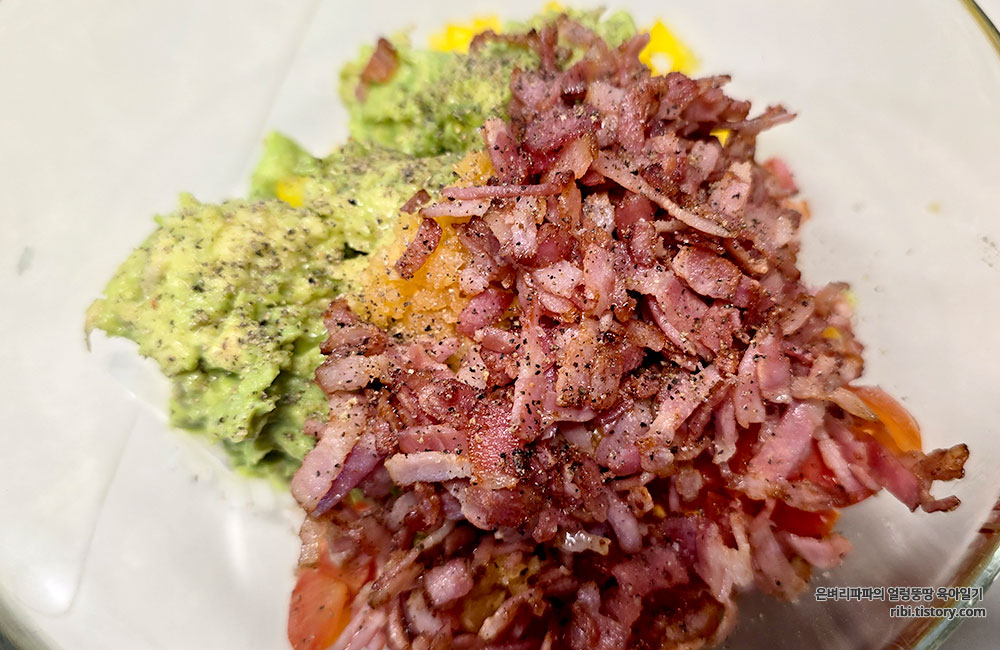 재료 : 아보카도, 양파, 파프리카, 베이컨, 방울토마토, 베이컨