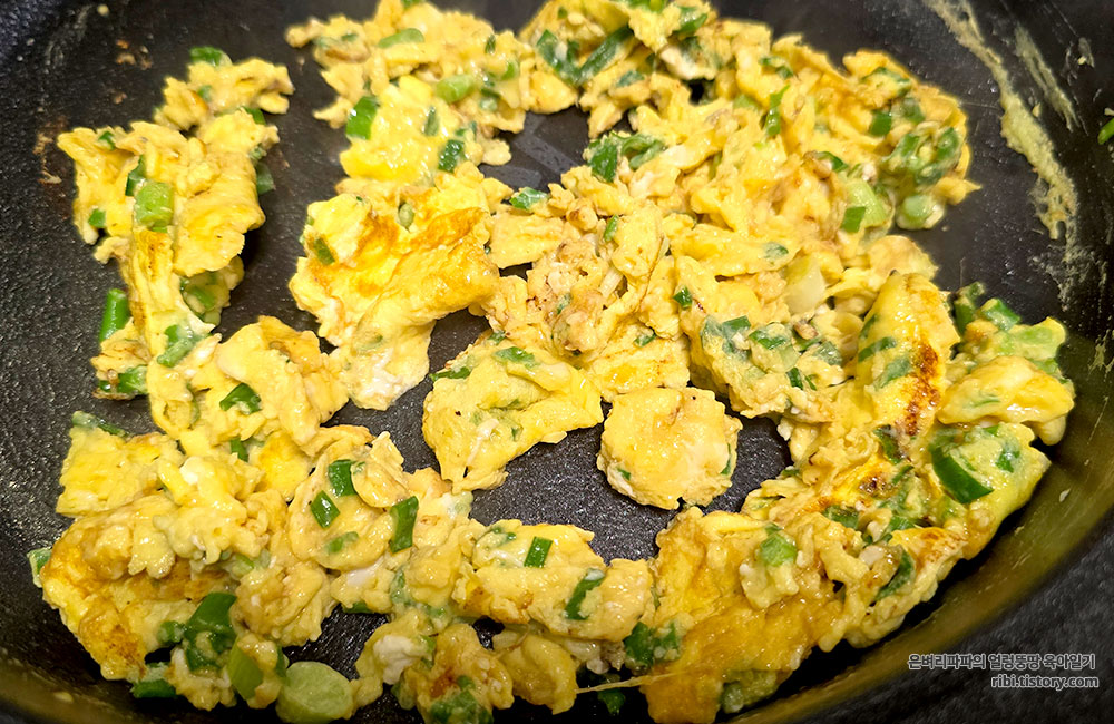 계란 스크램블은 소금, 후추 한 꼬집 넣어 쪽파를 가득 썰어 넣어 준비했어요.
