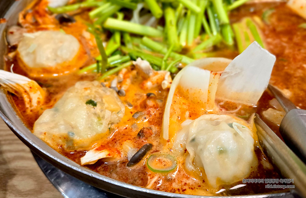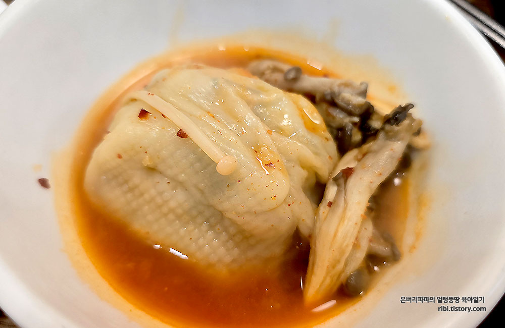 즉석으로 빚은 손만두가 들어간 버섯 매운 칼국수로