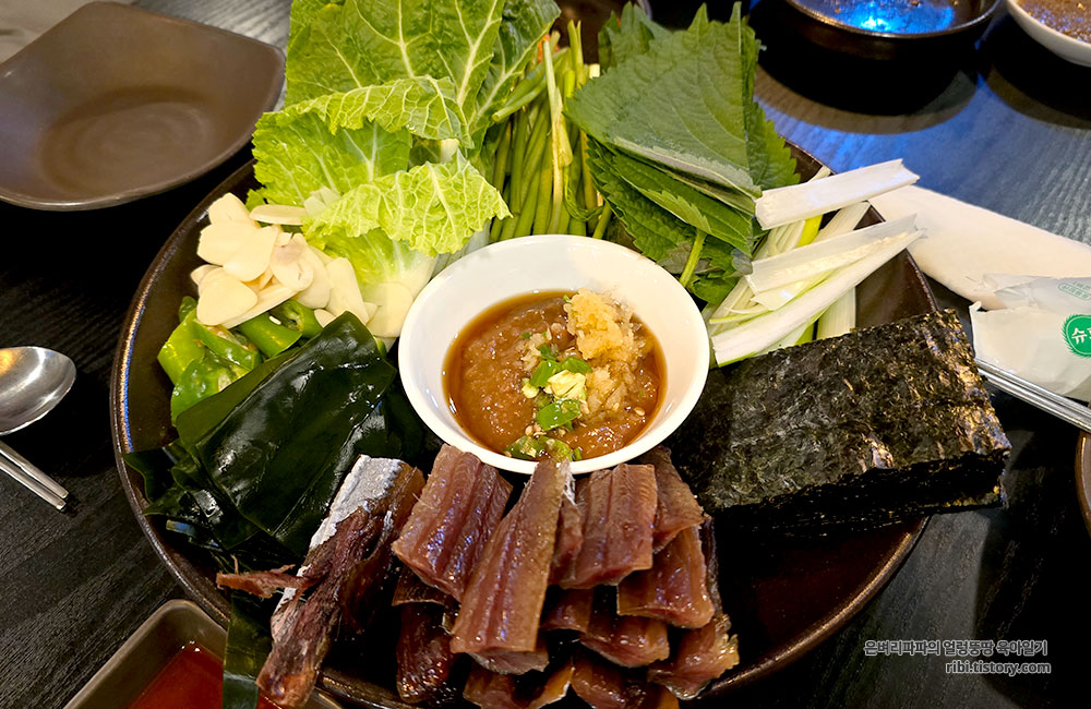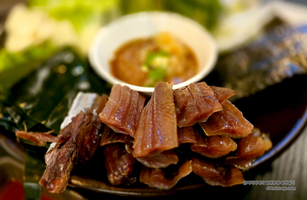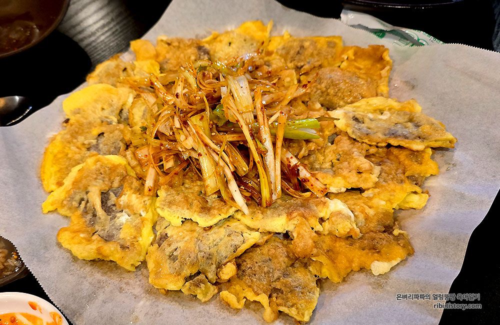 일행은 석화가 포함된 굴보쌈과, 제철 과메기, 그리고 육전을 주문했습니다.