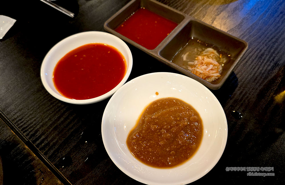 가장 먼저 안주와 관련된 초장과 새우젓, 된장이 나왔습니다.