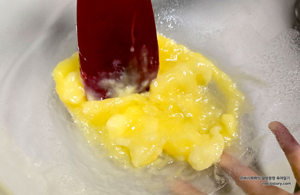 힘들게 버터를 부드럽게 풀고 나서, 풀어놓은 계란을 섞어줍니다.