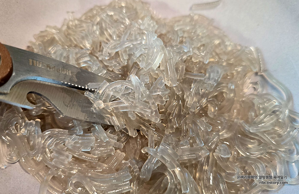 전자레인지에서 꺼낸 당면은 가위로 잘게 잘라주세요.