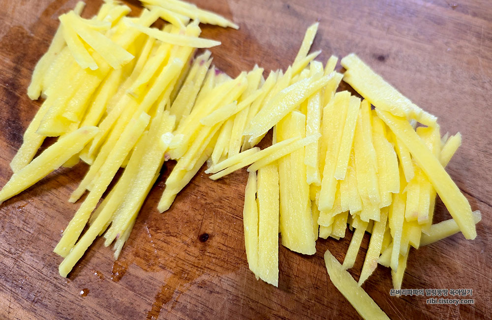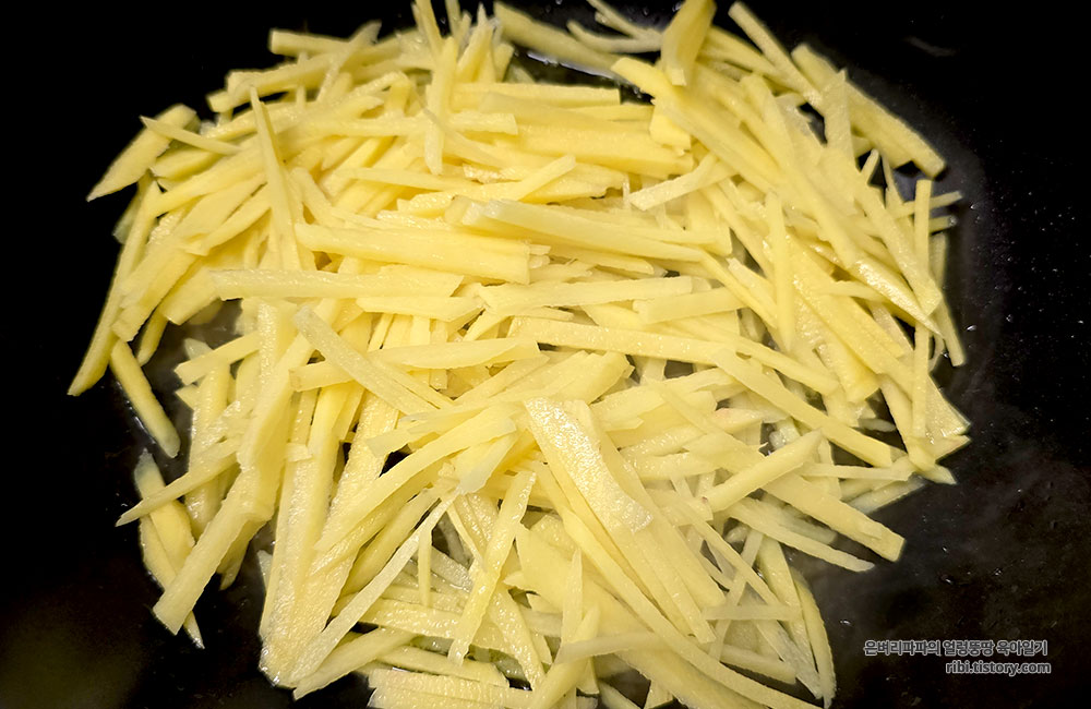 채 썬 감자는 꼭 찬물에 담가 전분기를 제거해 줍니다.