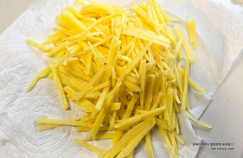 찬물에 담가운 채 썬 감자는 치킨타월로 수분을 충분히 닦아주세요.