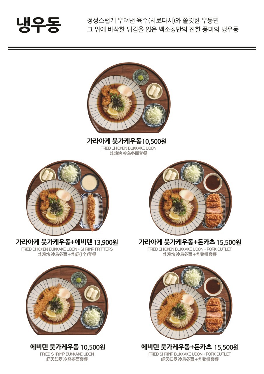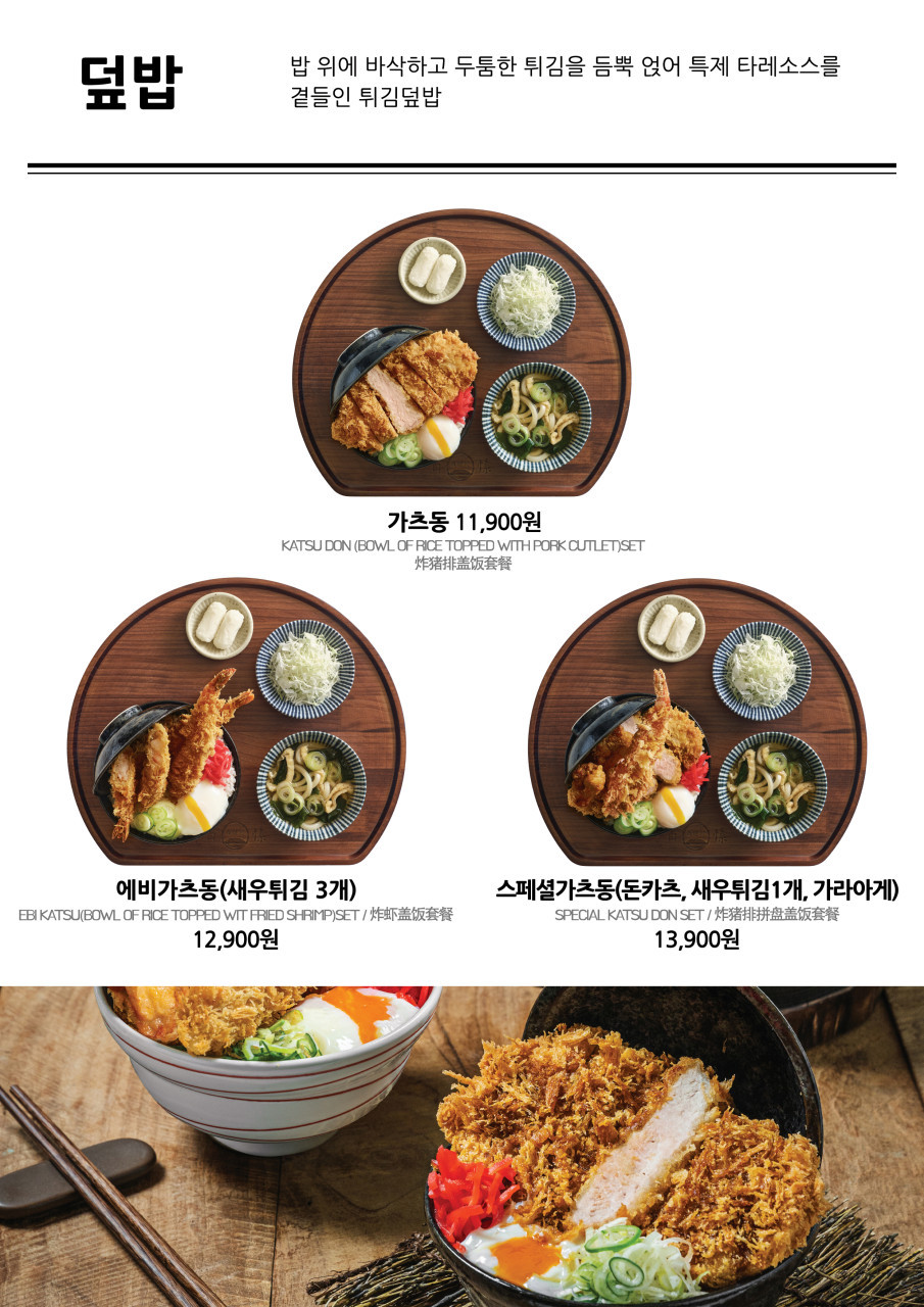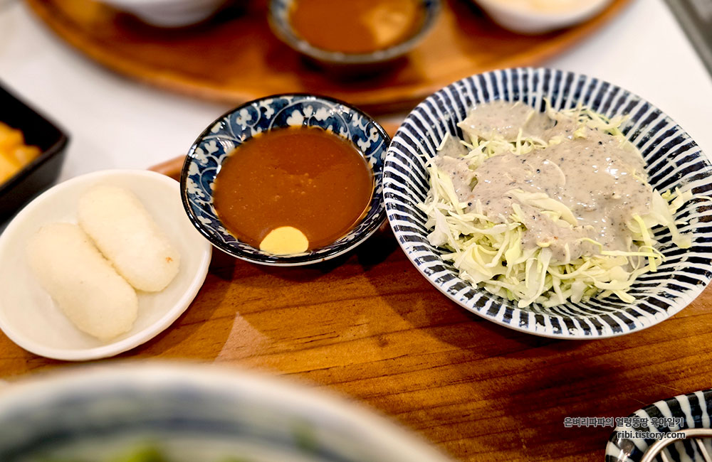 모든 메뉴에는 흑임자 소스가 곁들여진 양배추샐러드와 튀긴 떡이 제공됩니다.