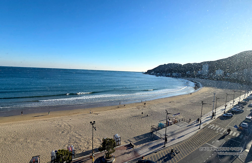 넓은 통창 너머로 송정 해수욕장의 하얀 백사장과 푸른 파도가 한눈에 들어와요.