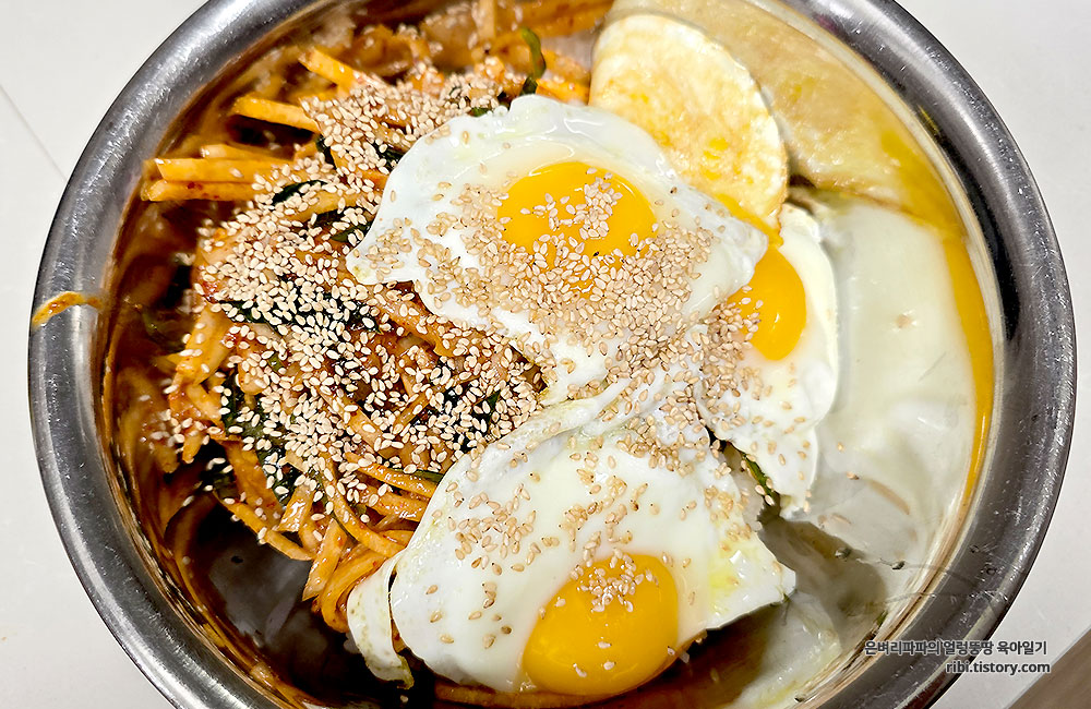 그 위에 무생채를 듬뿍 얹고 반숙계란프라이, 참기름, 참깨를 뿌려 마무리합니다.