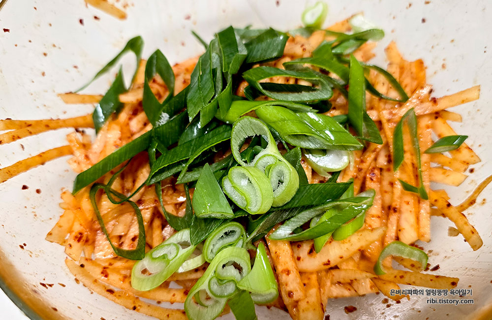 이는 무에 고춧가루의 색과 맛이 잘 스며들도록 하기 위함입니다.