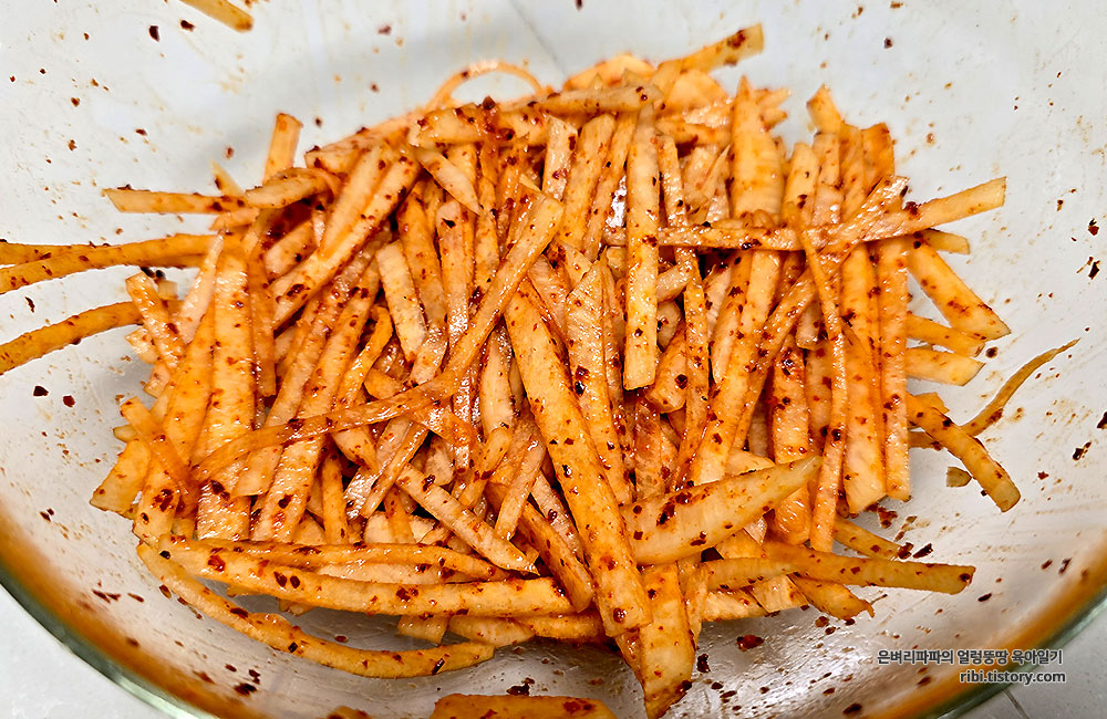 채 썬 무에 가장 먼저 고춧가루를 넣어 잘 버무려줍니다.